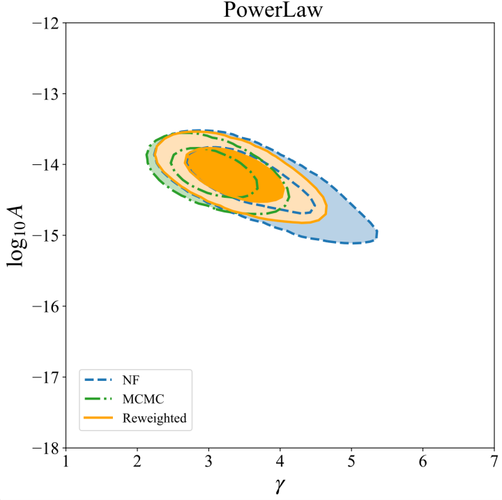 图2:三种方法:1) 机器学习的归一化流(蓝色虚线);2) 马尔科夫蒙特卡洛链采样(绿色横点线);3) 基于机器学习的重要性采样(橙色实线)在幂律谱模型参数空间的后验一致性对比。