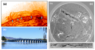 图1 巨型宁静日珥/暗条的观测形态。(a):太阳边缘观测到的日珥,青色箭头标记了日珥足,足之间为日珥空腔,引用自(Chen et al. 2022 A&A);(b):与宁静日珥形态相似的颐和园多孔桥,由作者拍摄;(c):日面上的宁静暗条与倒钩,引用自网络。