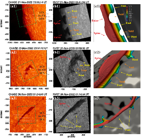 图3 真实日珥/暗条与模拟日珥的对比:从太阳边缘到日面。(a1-a3)是中国羲和号卫星的观测图像。(b1-b3)是抚仙湖一米新真空太阳望远镜的观测图像。(c1-c3)中的彩色团块是由磁凹陷代表的模拟日珥的形态。箭头标记出了对应的日珥“多孔桥”结构。
