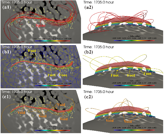 图4 日珥磁拓扑:脊柱(a1、a2)、足(b1、b2)与空腔(c1、c2)对应的三维磁场结构。彩色团块表示日珥磁凹陷区域。红、黄、橙色磁力线穿过了对应的脊柱、足、空腔的结构。箭头标记出了这些结构。