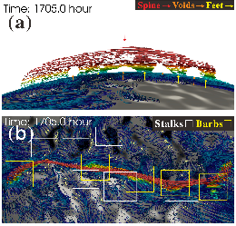 图2 数值模拟中太阳边缘(a)的日珥和日面上(b)的暗条。黑白色底面表示太阳表面的径向磁场。彩色线段集合表示可以承载日珥等离子体的磁凹陷区域。(a)中用红、黄、橙色标记出了脊柱、足与空腔结构。(b)中黄框标记出了图1中的暗条倒钩。